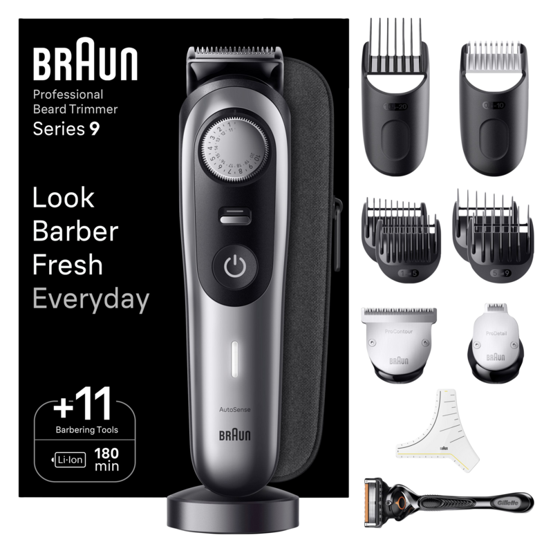 Met de Braun BT9440 maak je vloeiende overgangen tussen je haar en baard met de meegeleverde kammen. Je krijgt ook professionele opzetstukken waarmee je jouw contouren bijwerkt en details creëert. De baardtrimmer meet de lengte van je baard en past daar automatisch de scheerkracht op aan. Je stelt de trimlengte met stappen van 0,5 millimeter in via de draaiknop. Je doet lang met een volle accu, want de gebruiksduur is 180 minuten. Wanneer de accu leeg is, zet je de trimmer op het oplaadstandaard. Je trimt ook onder de douche. Hij is namelijk volledig waterdicht. Ga je op reis? Dan neem je de trimmer mee in het reisetui.