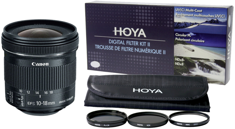De Canon EF-S 10-18mm f/4.5-5.6 IS STM + Hoya Digital Filter Introduction Kit 67mm is een bundel voor beginnende lanschaps- en architectuurfotografen. In de filterset zit een circulair polarisatiefilter, multicoated uv-filter en NDX8-grijsfilter. De uv- en polarisatiefilters filteren licht weg, waardoor je geen last hebt van reflecties, zweem en blauwe wazen. Handig voor landschapsfotografie. Het grijsfilter verhoogt het contrast van je foto’s en maakt ze beweeglijker. Zo wordt de zee een plat wateroppervlak. De 10-18mm lens heeft een extreem grote beeldhoek van 107 graden. Hiermee leg je grote gebouwen en weidse landschappen vast. Dankzij de beeldstabilisatie fotografeer je ook bij langere sluitertijden uit de hand. De lens is voorzien van speciale coatings en glaselementen die ervoor zorgen dat je foto’s sprekende kleuren en een contrast hebben.