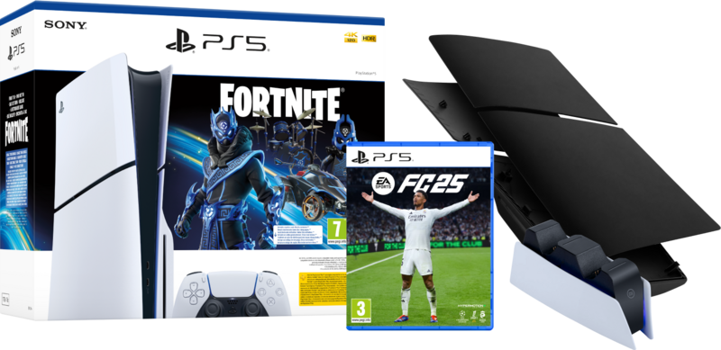 Spring uit de Fortnite Battle Bus in stijl met deze PlayStation 5 Slim Disc Edition + Fortnite Voucher + FC 25 + Covers Zwart + Oplaadstation bundel. Bij deze bundel krijg je een voucher voor 1.000 V-Bucks en een exclusief skin pakket meegeleverd. Zo ga je goed van start in jouw Fortnite seizoen. Ook trap je jouw digitale voetbalseizoen af in EA Sports FC 25. Ook maak je jouw PlayStation 5 Slim zwart. Ben je klaar met gamen? Dan leg je de DualSense controller in het oplaadstation. Zo speel je altijd met een volle accu tijdens je volgende game sessie. Je maakt jouw PlayStation 5 zwart met de meegeleverde covers. Hierdoor kleurt hij goed bij de rest van je setup. Met de PlayStation 5 Slim Disc Edition breng je jouw game ervaring naar een hoger niveau. Deze PlayStation 5 heeft een cd lade, waardoor je naast games ook blu-ray films afspeelt. De PS5 Slim is 30 procent kleiner dan zijn voorganger. Hierdoor neemt hij minder ruimte in op je bureau of naast je tv. Daarnaast heeft de Slim een opslag van 1 terabyte, waar de originele PlayStation 5 825 gigabyte opslagruimte heeft. Door de krachtige grafische processor in deze console game je in 4K resolutie met een maximale verversingssnelheid van 120 hertz. De SSD zorgt voor 20 keer snellere laadtijden in games dan op voorgaande PlayStation consoles. Speel je veel RPG of shooter games? Met 3D audio hoor je precies waar je tegenstanders vandaan komen. In-game bestuur jij jouw personage met de meegeleverde DualSense controller. Deze heeft voelbare feedback en trigger effecten, waardoor je niet alleen ziet en hoort, maar ook voelt wat er in je game gebeurt.