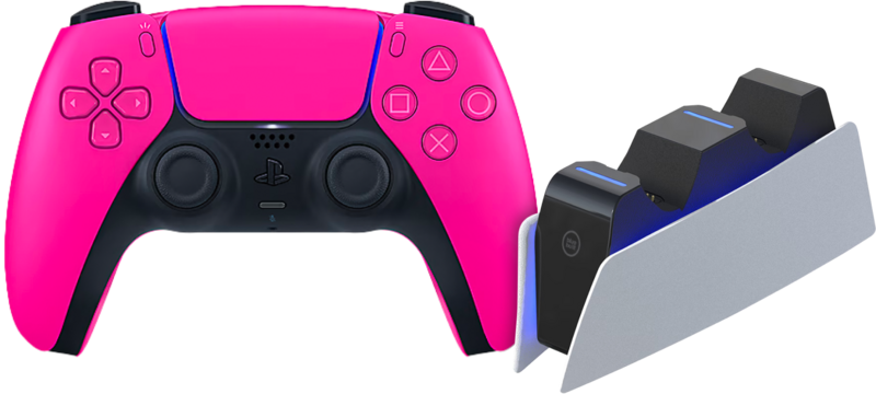 Met deze Sony PlayStation 5 DualSense Draadloze Controller Nova Pink + BlueBuilt oplaadstation bundel laad je tot 2 controllers tegelijk op. Zo speel je altijd met een volle accu en game je draadloos. Wil je controllers opladen terwijl je PS5 niet aan staat? Dan heb je een oplader adapter met usb A aansluiting nodig. De DualSense controller heeft haptische feedback, waardoor je bijvoorbeeld voelt wanneer je door de grindbak rijdt in een race game. Ook heeft de controller dynamische trigger effecten, triggers met weerstand die zich aanpassen aan de game die je speelt. Wanneer je een boog spant om een pijl te schieten, voel je dat de spanning op je vingers opbouwt.