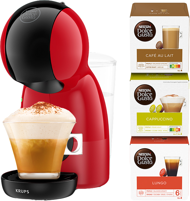 Ga meteen aan de slag met koffiezetten dankzij de Krups NESCAFÉ Dolce Gusto Piccolo XS + 48 capsules. Dankzij de meegeleverde cups probeer je meteen verschillende koffies uit. De machine past in elke keuken dankzij het compacte formaat en moderne design. Doe de capsule in de machine en haal de hendel over. Zo geniet je van een krachtige espresso of een romige cappuccino in een handomdraai. Met dit koffieapparaat zet je niet alleen koffie, maar ook warme chocolademelk, thee en koude dranken. De koffiemachine warmt in 40 seconden op. Deze duurzame machine schakelt na één minuut automatisch uit. Je zet melkspecialiteiten met melkpoedercups, maar niet met verse melk.
