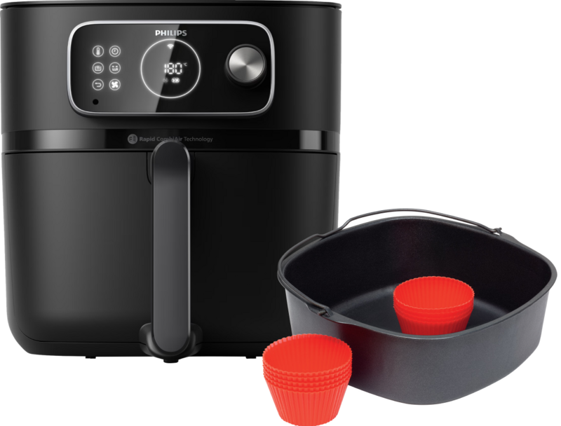 Je bereidt met de Philips Airfryer XXL Connected HD9875/90 + Bakvorm ook ovenrecepten, dankzij de meegeleverde bakvorm. Zo bak je ook een hartige taart of muffins. De airfryer gebruikt de Rapid CombiAir technologie. Deze technologie stemt de juiste baktemperatuur, -tijd en luchtsnelheid af op jouw type bereiding. Zo is jouw gerecht mals aan de binnenkant en knapperig aan de buitenkant. Je bakt 6 porties frietjes tegelijkertijd door het laadvermogen van 2 kilogram. Handig, als je uit een groot huishouden komt of vaak visite over de vloer krijgt. De airfryer bedien je zowel met je smartphone als via het display. In de HomeID app stuur je het recept naar de airfryer en houd je de baktijd vanaf de bank in de gaten.