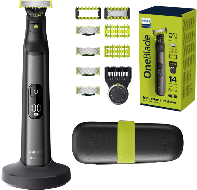 Met de Philips OneBlade Pro 360 QP6651/30 + Face and Body kit haal je een trimmer met een voorraad mesjes voor 16 maanden in huis. De set bestaat uit 3 extra scheermesjes, een lichaamskam en een huidbeschermkap. Je neemt de timmer veilig mee op vakantie dankzij de meegeleverde reisetui. De trimmer heeft een opzetkam met 14 standen. Hiermee trim je in lengtes van 0,4 tot en met 10 millimeter. Met het OneBlade mesje scheer en trim je lichaams-, baard-, en hoofdhaar. Wanneer je je lichaamshaar scheert, gebruik je de lichaamskam. Je gebruikt de huidbeschermkap als je gevoelige delen van je lichaam trimt. De accuduur zie je op het display. In totaal scheer je 120 minuten lang. Is de trimmer leeg? Dan laad je deze binnen één uur weer volledig op.