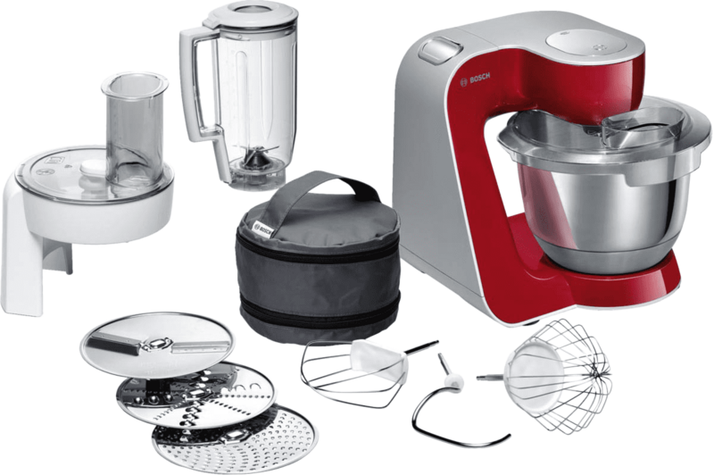 Met een krachtige motor van 1000 watt en 7 snelheden is de Bosch MUM58720 CreationLine zeer geschikt voor het zware kneedwerk. De rvs mengkom heeft genoeg ruimte voor bijvoorbeeld 2,7 kilo cakebeslag of 1,9 kilo brooddeeg. De klop- of kneedsnelheid bouwt rustig op om spetteren te voorkomen. Je tilt de arm op met 1 druk op de knop. Zo verwissel je de deegaccessoires eenvoudig. Maar deze keukenmachine kan meer dan kneden en kloppen. Met de blender van 1,25 liter maak je lekkere smoothies. De foodprocessor gebruik je om harde groenten en fruit te raspen of in plakken te snijden. Wanneer je klaar bent, berg je de opzetstukken op in de meegeleverde accessoiretas.