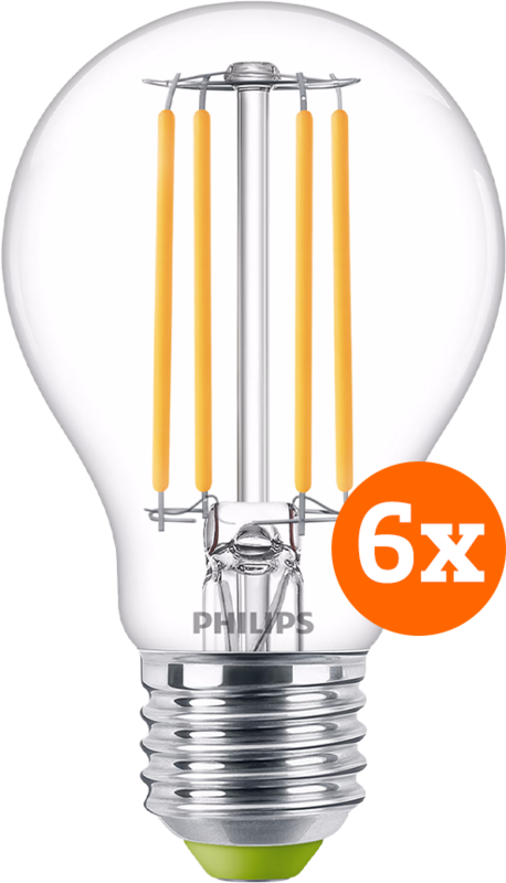 Met het Philips led E27 lampen 6-pack uit de Groene lijn van Philips kies je voor Philips meest energiezuinige ledlamp ooit, zonder in te leveren op lichtkwaliteit. Dankzij de zichtbare filamentdraden lijkt de ledlamp op een ouderwetse gloeilamp. Toch verbruikt hij maar 2,3 Watt. De lichtkleur is warm wit, wat zich vertaald in 3000 K. De lamp is direct op zijn volledige lichtsterkte van 485 lumen. Dit is vergelijkbaar met een gloeilamp van 40W. Deze Philips led lamp heeft een grote E27 fitting.