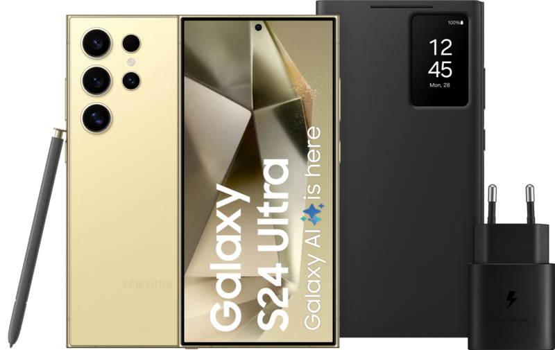 Met de oplader en het hoesje uit het Starterspakket heb je vanaf dag één de juiste accessoires in huis voor je Samsung Galaxy S24 Ultra 512GB Geel 5G. De 25 watt snellader laadt de batterij binnen 30 minuten voor ongeveer 60 procent op. Met de Smart View Book Case bescherm je jouw toestel tegen schade. De Samsung S24 Ultra is een topklasse smartphone waar je haarscherpe foto’s mee maakt. Met de telelens van de S24 Ultra zoom je zelfs 5 keer in zonder kwaliteitsverlies. Bovendien bewerk je foto’s eenvoudig met de ingebouwde Galaxy AI assistent. De Samsung S24 Ultra is geschikt voor de zwaarste taken. Met de meegeleverde S Pen stylus bedien je de S24 Ultra extra nauwkeurig. De S24 Ultra heeft een heel groot 6,8 inch quad hd scherm. Hierop kijk je in de hoogste kwaliteit naar je favoriete films en series. Dankzij de grote 5.000 mAh batterij gaat deze Samsung smartphone bij gemiddeld gebruik een hele dag mee. Op het ruime 512 GB opslaggeheugen bewaar je jouw foto’s, apps en sla je zelfs meerdere seizoenen van je favoriete serie op. Heb je nog meer ruimte nodig? Kies dan voor de 1TB variant van de S24 Ultra.
