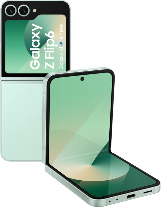 De Samsung Galaxy Z Flip 6 256GB Mint 5G is een vouwbare smartphone. Opengeklapt gebruik je het 6,7 inch full hd scherm van de Samsung Flip 6 als normale smartphone. Als je de Flip 6 dichtklapt, bekijk je op het compacte 3,4 inch scherm aan de buitenkant je meldingen of verstuur je berichten. De Samsung Flip 6 is geschikt voor de zwaarste taken. Je speelt bijvoorbeeld 3D games of bewerkt foto’s en video’s met Galaxy AI. Aan de achterkant van de Flip vind je 2 camera’s waar je haarscherpe foto’s mee maakt. De 4.000 mAh batterij is aan de kleine kant, dus je moet deze Samsung smartphone soms gedurende de dag opladen. Op het 256 GB opslaggeheugen van de Samsung Flip 6 is ruimte voor je apps, foto’s en andere bestanden. Heb je meer ruimte nodig om bijvoorbeeld series en films te downloaden? Kies dan voor de 512 GB variant de Flip 6.
