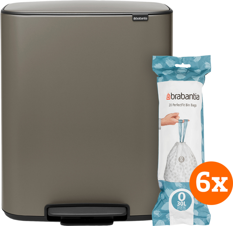 Met de Brabantia Bo Pedal Bin 2 x 30 Liter Platinum + Vuilniszakken (120 stuks) vang je gelijk je afval op, dankzij de meegeleverde vuilniszakken. Dankzij de 2 binnenemmers scheid je gemakkelijk plastic of GFT van het restafval. De binnenemmers zijn uitneembaar, zodat je de vuilniszakken snel wisselt en de prullenbak makkelijk schoonmaakt. Handig, wanneer de ene zak sneller vol is dan de andere of wanneer er iets is gelekt in één van de bakken. Aan de zijkanten van de prullenbak zitten 2 handvatten, waarmee je de prullenbak gemakkelijk verplaatst. Je opent de prullenbak met je voet, zodat je handen vrij zijn voor het afval. Daarbij blijft de deksel schoon, doordat je deze niet aanraakt bij het openen.
