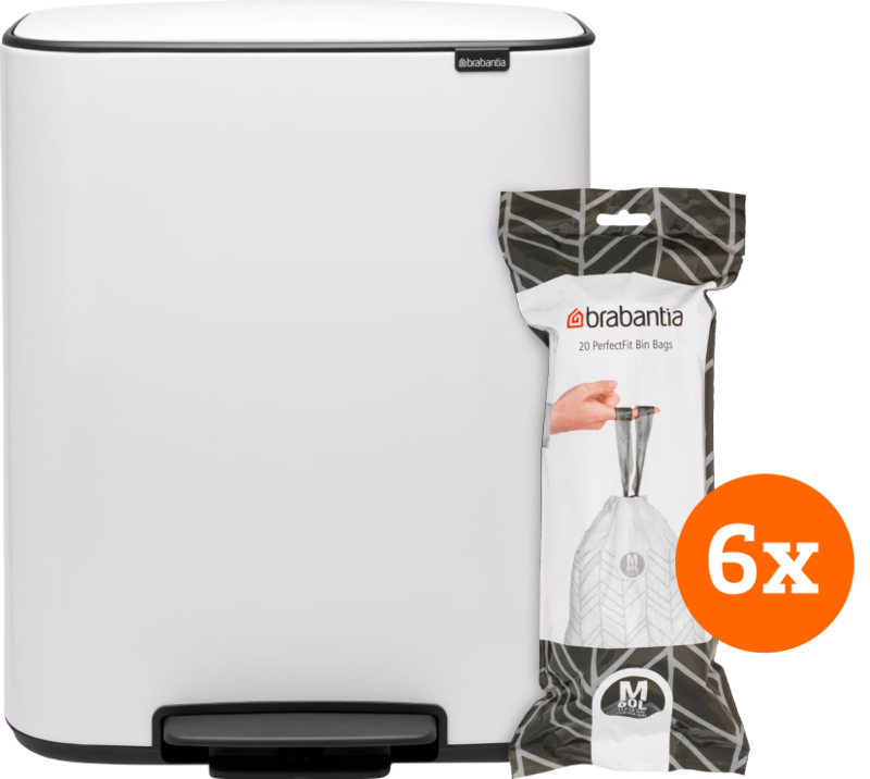 Met de Brabantia Bo Pedal Bin 60 Liter White + Vuilniszakken (120 stuks) vang je gelijk je afval op, dankzij de meegeleverde vuilniszakken. Je opent de prullenbak eenvoudig met je voet, zodat je jouw handen vrij hebt. Zo gooi je gemakkelijk grote hoeveelheden in één keer weg en blijft de deksel schoon. Het strakke, rechthoekige design maakt dat de prullenbak mooi in jouw moderne keuken past. Daarnaast neemt ‘ie door de vorm minder ruimte in, doordat je ‘m tegen de muur zet. Dankzij de uitneembare binnenemmer vervang je gemakkelijk de vuilniszak en maak je de prullenbak eenvoudig schoon.