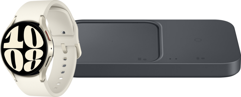 Met de Samsung Galaxy Watch 6 Crème 40mm + Samsung Duo Draadloze Oplader laad je jouw smartwatch tegelijk met je smartphone of oordopjes op. Zo heb je geen gedoe meer met kabels. Verbeter je gezondheid met de Samsung Galaxy Watch 6. Met deze smartwatch ben jij altijd op de hoogte van je hartslag, aantal stappen, stressniveau en slaapkwaliteit. De Galaxy Watch 6 is sneller en heeft een groter scherm dan zijn voorganger, de Watch 5. Hierdoor wissel je snel tussen verschillende apps op je horloge. Met slaapcoaching in de Samsung Health app analyseer jij je slaappatroon en krijg je tips hoe je dit verbetert. Ook maak je met de Watch 6 een gezondheidsscan. Hiermee krijg je inzicht in hoeveel spiermassa of vetmassa je hebt. Dit helpt je om je gezondheidsdoelen te behalen. Ook je sportprestaties houd je met deze Watch 6 nauwkeurig bij. Je belt met de smartwatch als je jouw smartphone bij je hebt. Andere Samsung apparaten, zoals je Galaxy Buds of tablet, bedien je ook via je Galaxy Watch. De batterij gaat bij gemiddeld gebruik 1 tot 2 dagen mee.