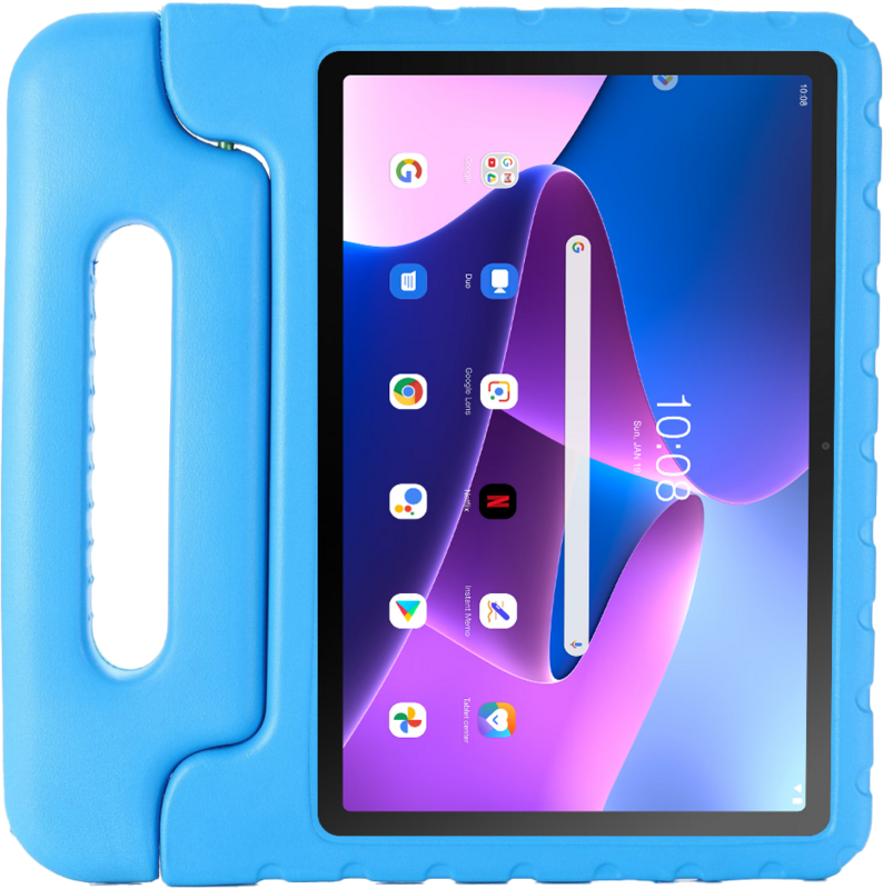 Doe je tablet in de Just in Case Lenovo Tab M10 (3e generatie) Kids Cover Blauw en geef hem met een gerust hart aan je kinderen. Je tablet blijft vrij van beschadigingen dankzij de stevige siliconen hoes. De extra dikke rand bedekt je apparaat aan alle kanten en vangt de klap op als je kinderen de tablet laten vallen. Aan de zijkant zit een handig handvat, dus je neemt de tablet gemakkelijk overal mee naartoe. Buig het handvat en zet de tablet rechtop neer. Zo kijken je kinderen een film zonder dat ze de tablet vasthouden. De hoes is vrij stug, dus de tablet valt er niet zomaar uit. Wil je ook dat je scherm vrij blijft van krassen en butsen? Koop er dan een screenprotector bij.
