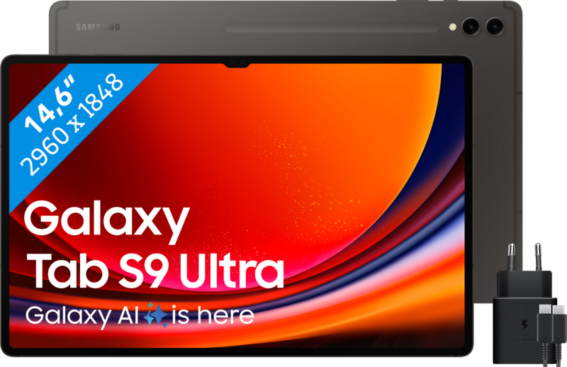Laad je tablet direct snel op met de Samsung Galaxy Tab S9 Ultra 14.6 inch 256GB Wifi Zwart + Samsung Oplader. Dit doe je 2 keer sneller dan met een normale snellader. Door de krachtige processor speel je 3D games en zware apps zoals foto- en videobewerking. Dankzij het grote 14.6 inch scherm kijk je comfortabel naar je favoriete films in de hoogste kwaliteit. Je geniet van heldere kleuren en vloeiende bewegingen. De Tab S9 Ultra is water- en stofbestendig, dus je kijkt ook een film in bad of bij het zwembad. Met de meegeleverde S Pen stylus werk je nauwkeurig aan je schetsen en notities. Je bewerkt gemakkelijk en sneller je foto’s of vat tekst samen met Galaxy AI op je tablet. Daarnaast gebruik je Galaxy AI ook voor het snel vertalen van verschillende teksten.