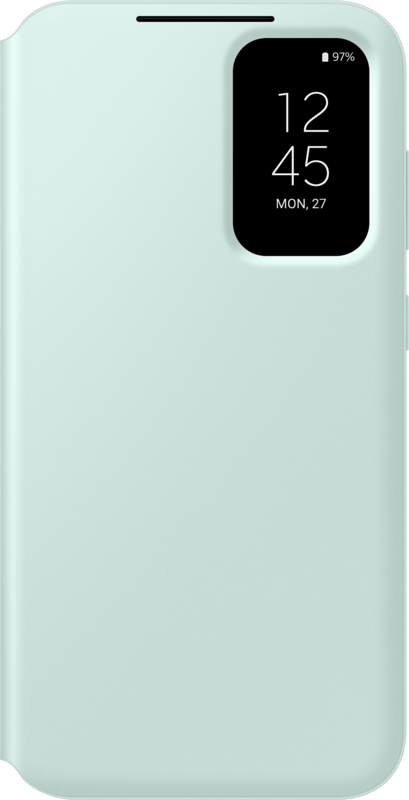 De Samsung Galaxy S23 FE Clear View Book Case Groen beschermt zowel de achterkant als het scherm van je smartphone. Je doet je toestel dus met een gerust hart in dezelfde tas of zak als je sleutels. Dit hoesje heeft een doorzichtige strip in de voorflap. Je ziet de tijd, je meldingen en de status van je batterij, zonder dat je het hoesje openklapt. In de voorflap die het scherm bedekt, is ook ruimte voor een pasje of wat contant geld. Klap de flap om en je hebt een standaard. Daarmee zet je je Samsung S23 FE in landschapsmodus neer wanneer je een filmpje kijkt. Deze book case heeft uitsparingen voor onder andere de aansluitingen en knoppen van jouw S23 FE. Hierdoor kun je jouw oplader gemakkelijk aansluiten of het geluid van je toestel regelen.