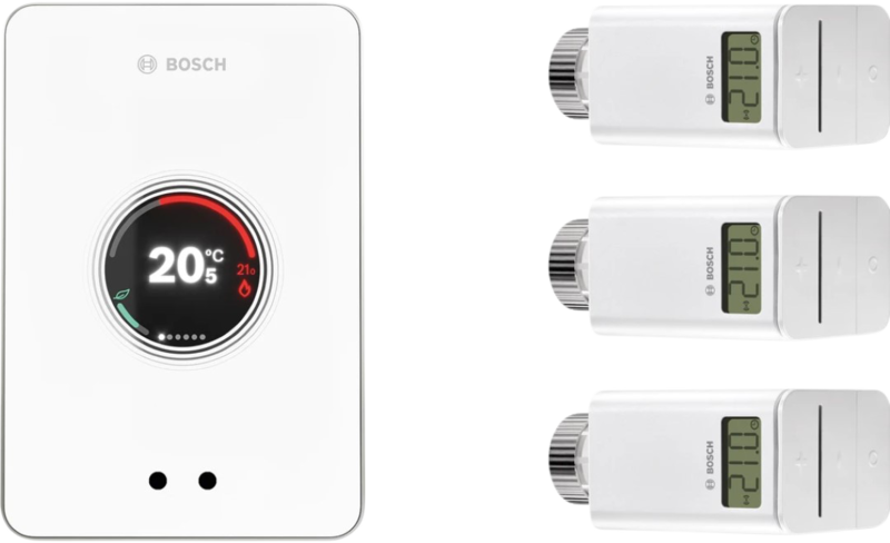 Met de Bosch EasyControl Set CT200 stook je thuis extra zuinig. Dankzij de 3 meegeleverde radiatorthermostaten regel je de temperatuur ook per ruimte. Zo hoef je niet onnodig te verwarmen in een kamer waar je niet bent. Je stelt de verwarming eenvoudig met de app. Ook laat je de verwarming automatisch uitschakelen als je van huis gaat. Kom je weer thuis, dan zorgt de slimme thermostaat ervoor dat je huis weer snel verwarmd is. Let op: om deze thermostaat te gebruiken met een reguliere OpenTherm of aan/uit-thermostaat, heb je een Bosch EasyControl Adapter nodig, deze is niet meegeleverd. De radiatorthermostaten werken alleen op radiatoren waar je nu een thermostatische kraan hebt. Deze herken je aan de cijfers op de knop.
