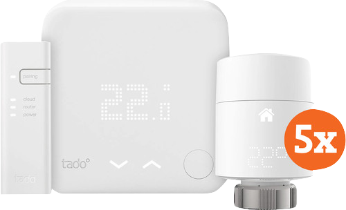 Met dit Tado Slimme Thermostaat V3+ Startpakket met 5 knoppen verwarm je een huis met een cv-ketel, warmtepomp of stadsverwarming. De Thermostaat werkt met bijna alle verwamingssystemen. Daarnaast stel je 5 radiatoren apart in met de meegeleverde radiatorthermostaat. De V3+ is compatibel met alle slimme platformen zoals Google Assistant, Alexa, Apple HomeKit en IFTTT. De thermostaat bedien je waar je ook bent via de Tado-app. Met de functie Quick Actions pas je de temperatuur in meerdere kamers tegelijk aan. Doordat de thermostaat continu in contact staat met je smartphone, weet hij precies wanneer je in de buurt bent van je huis (geofencing). Hierdoor ben je nooit meer onnodig aan het stoken en bespaar je een hoop kosten.