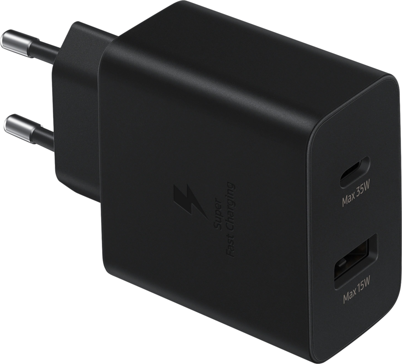 Laad 2 apparaten tegelijk extra snel op met de Samsung Super Fast Charging Oplader met 2 Usb Poorten 35W. Deze oplader heeft 2 snellaadpoorten en is geschikt voor het snelladen van alle soorten Samsung smartphones en tablets. Met de usb A snellaadpoort laad je alle Samsung smartphones snel op. Na een half uur opladen zit je lege batterij voor 40% vol. Met de usb C Super Fast Charging poort laad je Samsung S serie smartphone en S serie tablets nóg sneller op. Je haalt bij smartphones in een half uur opladen ongeveer 60%. Ook de Samsung A52 en A72 ondersteunen dit extra snelle opladen. Daarnaast laad je alle smartphones en tablets die Power Delivery ondersteunen snel op. Denk aan iPhones en iPads, maar ook toestellen van Sony en Xiaomi. Let op: als je 2 apparaten tegelijk oplaadt, gaat het opladen iets langzamer. Kies de Samsung 65W oplader om meerdere apparaten op maximale snelheid op te laden. Bij je smartphone krijg je een kunststof kabel meegeleverd. Kies een oplader met stevige nylon kabel als je wilt dat hij langer meegaat.