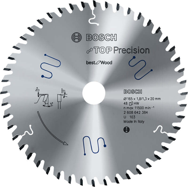 Zaag in alle soorten hout met het Bosch Cirkelzaagblad Top Precision Best for Wood, 165 x 20 x 1,8 mm, 48T. Door de 48 tanden krijg je een fijn en splintervrij resultaat. Het resultaat wordt extra glad door de Cleantex beschermlaag. De Cirkelzaagblad Top Precision Best for Wood heeft een doorsnede van 165 millimeter. Het asgat is 20 millimeter groot. Controleer goed of dit op jouw zaagmachine past.